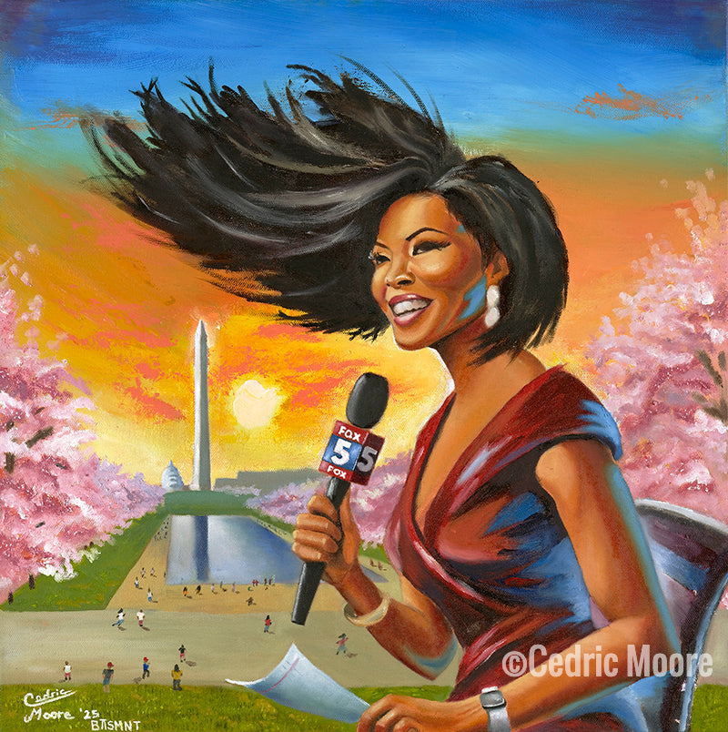 This piece was created by artist Cedric Moore as a live painting during FOX 5 DC’s Good Day DC and LION Lunch Hour in celebration of Women’s History Month. It stands as a tribute to the women who rise each day to inform, inspire, and lead.