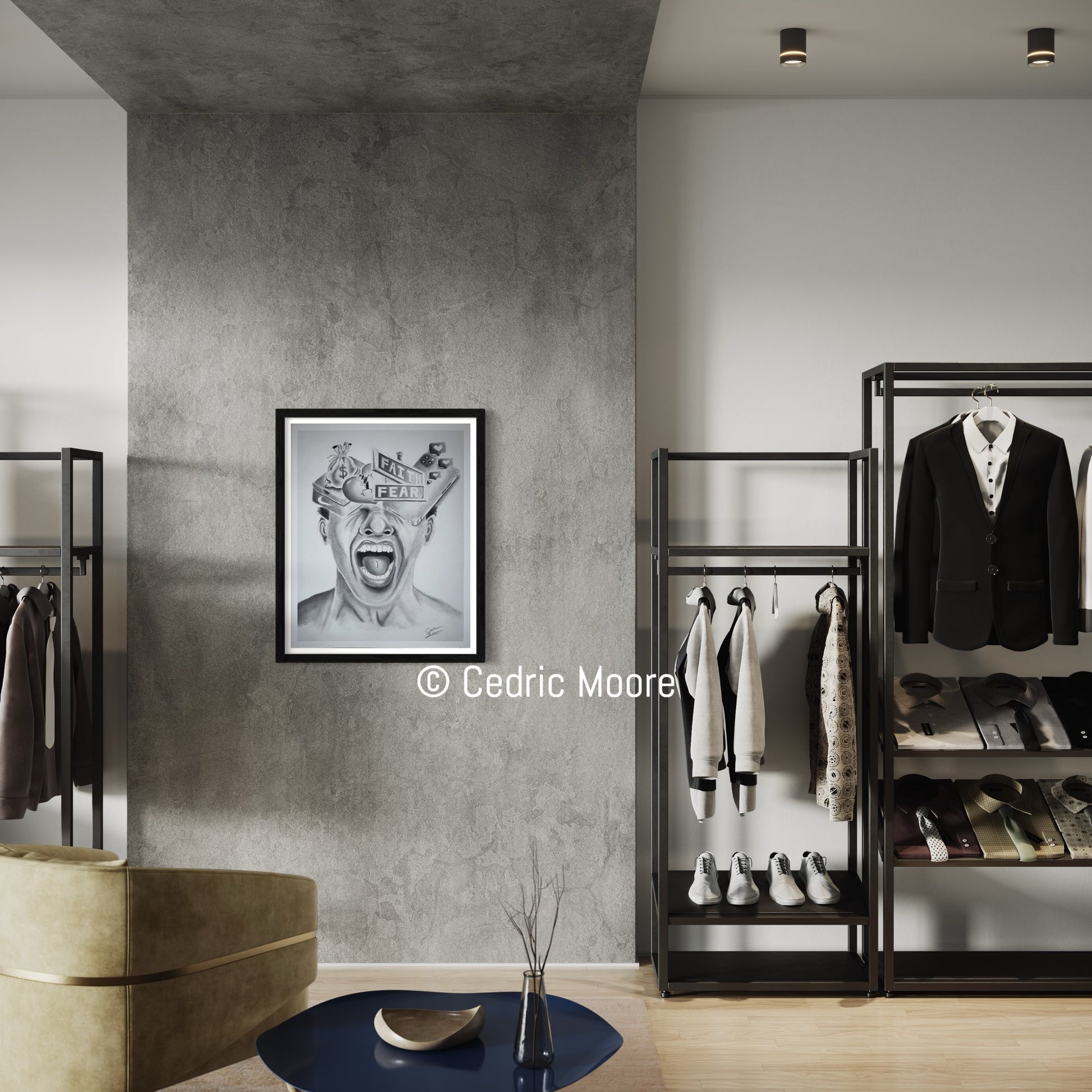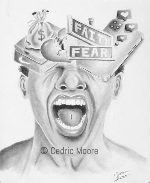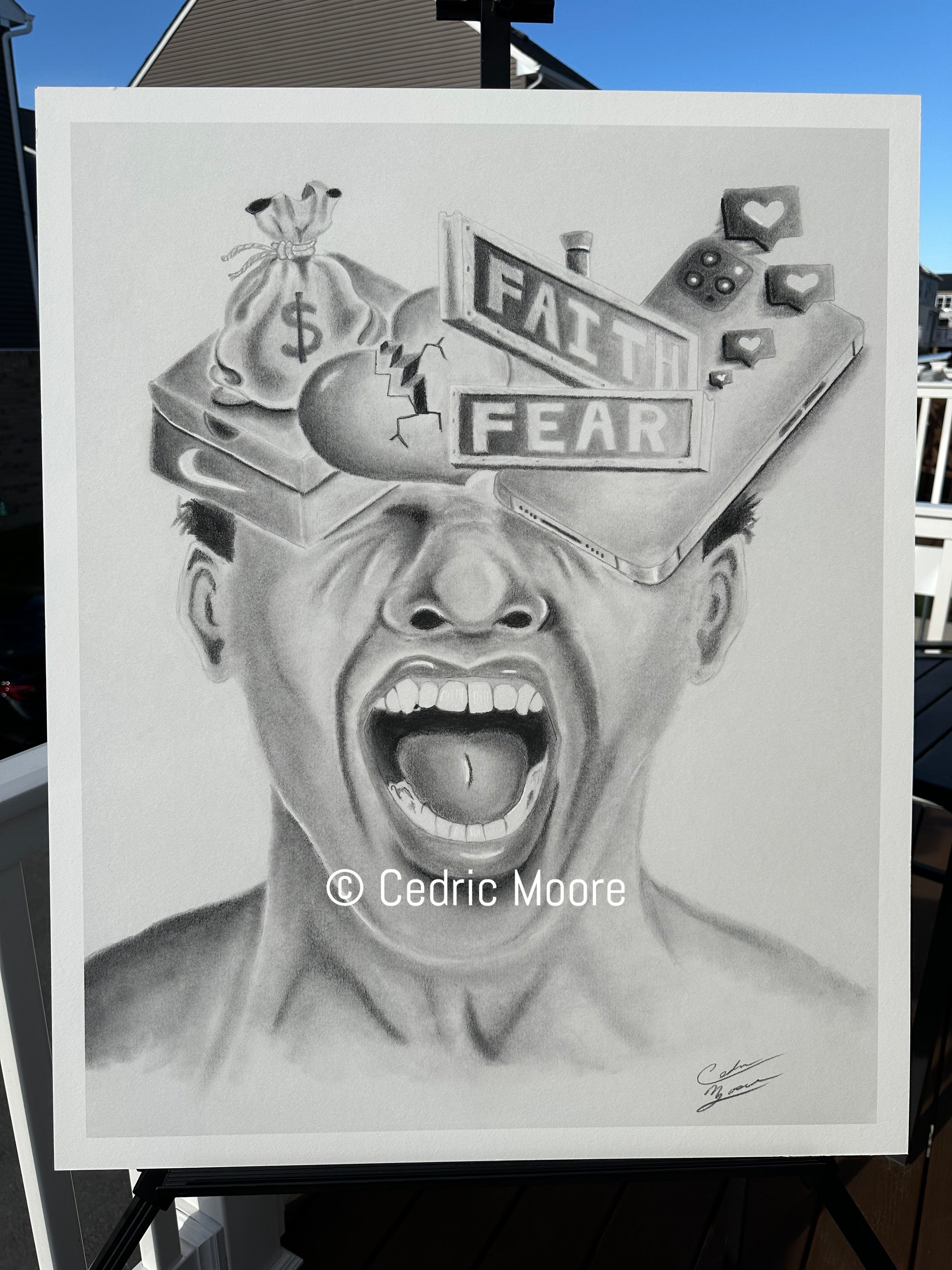 Embark on a journey with artist Cedric Moore as he makes his debut in the art industry with his inaugural print, 'Thinking Out Loud.' This evocative piece captures the intricate layers of a man's mind, visually portraying the tumultuous thoughts of addictions, priorities, the quest for validation in the social media realm, the ongoing struggle with unhealed emotional trauma, and the daily battle to consistently and intentionally choose faith over fear.